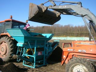 トラクターのフロントローダー等で、土を 上部のホッパーにあけるとホッパー内のコンべアーで、少しずつ下部に落とされ、その途中で、回転するチェーンなどで、土が粉砕され、その後 とおし状の回転式ドラムでふるい落とされ、いいものは画像右側の長いコンベアーで排出されます。